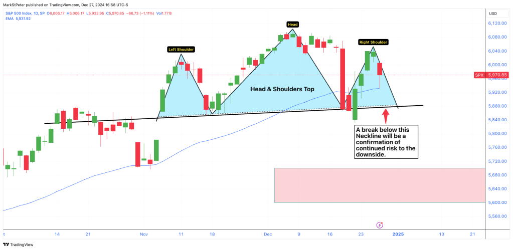 SPX, S&P 500, and SPY showing head and shoulders pattern. Top singling forming as we enter into the end of the year for 2024 and before we enter the new year of 2025.