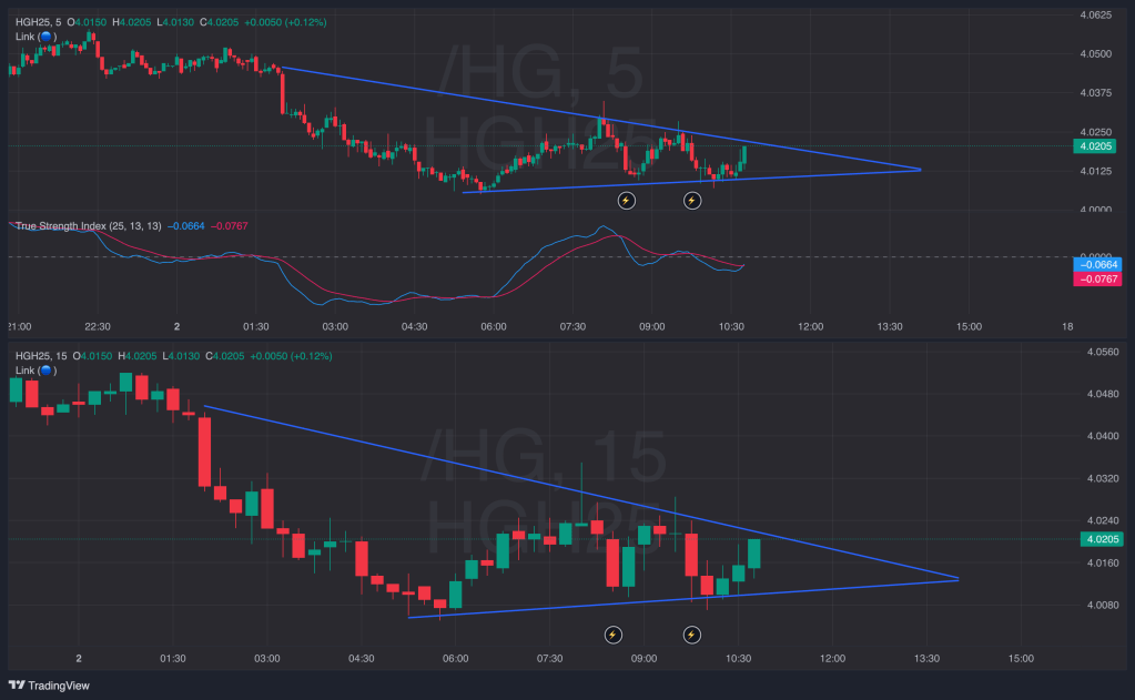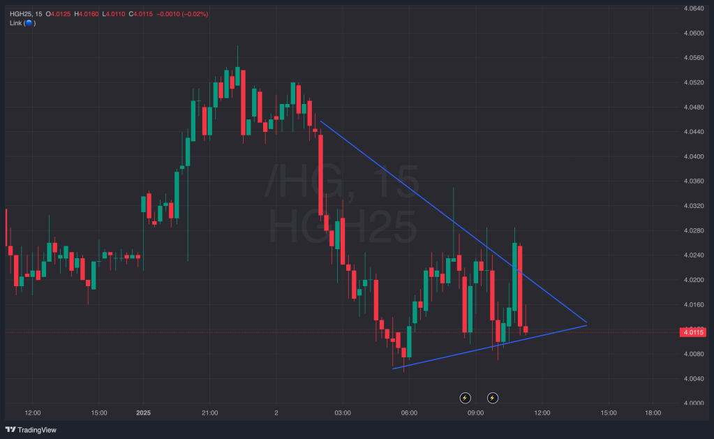 Copper presented an intriguing setup with a bearish pennant forming on the intraday charts and a TTM Squeeze indicator signaling a larger move. Despite recognizing the bearish setup, I took a long position after a brief breakout attempt.