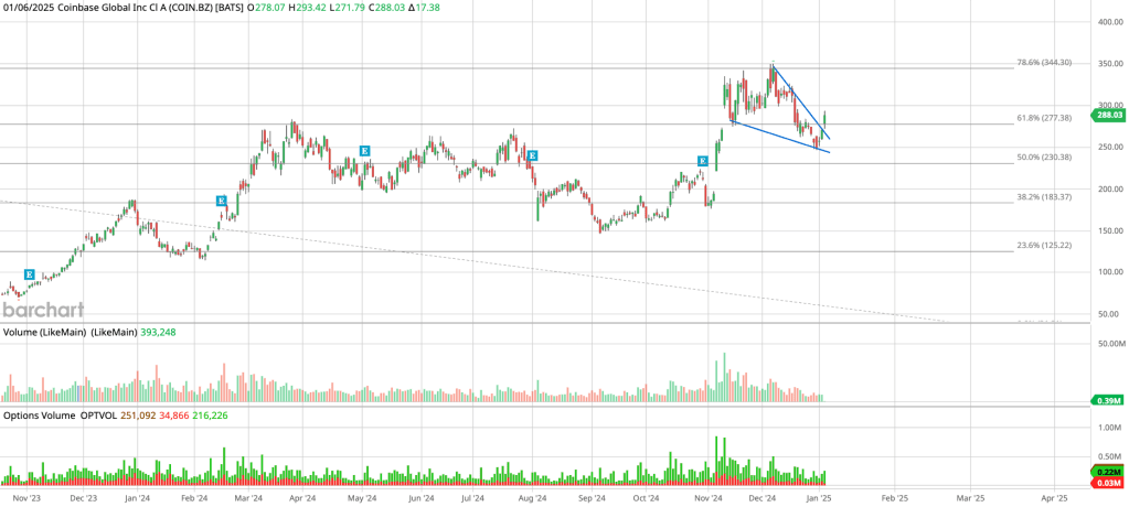 - Coinbase (COIN): Surged to $293 before cooling to $288. COIN continues to respect Fibonacci retracement levels. A move above $340 could be on the horizon if momentum holds.
